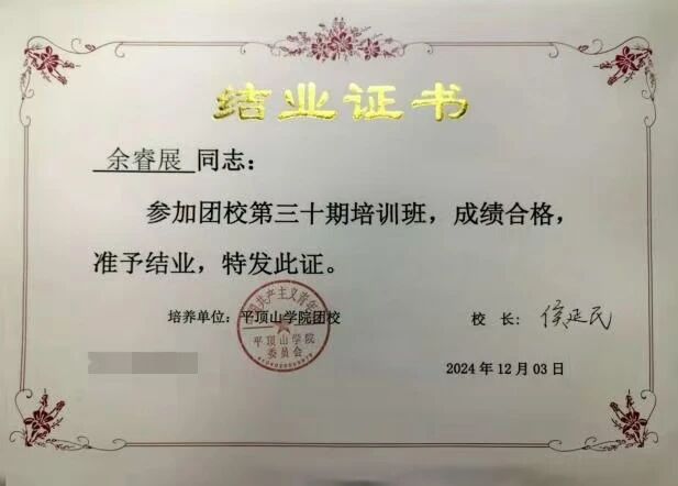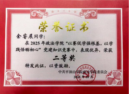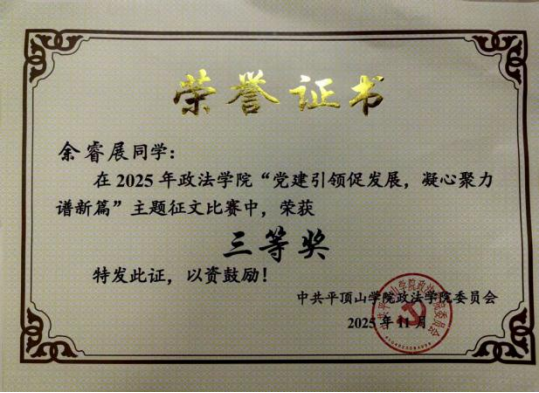 身兼双职,余睿展始终秉持“服务同学、奉献集体”的核心宗旨,以高度的责任感与高效的执行力推进各项工作。作为班级团支书,积极协助班主任开展班级管理、学风建设与活动组织工作,策划多场主题鲜明的团日活动与学习互助活动,搭建师生沟通的桥梁,增强班级凝聚力与向心力,助力班级获评2024-2025学年“先进班集体”。作为院系党务中心组织联络办公室员工干部,牵头梳理党员发展全流程,规范档案管理体系,统筹推进党员教育、组织生活开展等重点工作,优化工作流程、提升工作效率,切实保障院系党务工作规范有序运转,以扎实的工作成效赢得师生广泛认可。