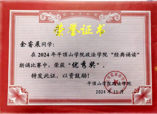 余睿展深知“立身以立学为先,立学以读书为本”,她始终保持勤奋踏实的学习态度,在专业领域深耕不辍。课内专注钻研法学专业知识,形成科学系统的学习方法,本学年学业及综合测评均位列班级第八,顺利通过普通话二级甲等考试。课外积极拓展知识边界,主动参与学科竞赛与学术实践,荣获“竞技宝官网经典朗诵优秀奖”“竞技宝官网春节书法比赛优秀奖”“竞技宝官网‘法思杯’辩论赛优秀奖”等多项荣誉;同时深度参与科研实践,投身平顶山市社科联项目并成功立项,在理论与实践的结合中锤炼专业本领,实现学业与能力的双重提升。